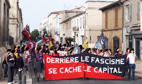 La manifestation a réuni environ 150 personnes dans une ambiance festive et revendicative, derrière une banderole portant le slogan « Derrière le fascisme se cache le capital ».