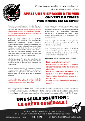 C’est pourquoi le syndicat CNT SEST Lorraine appelle toutes les travailleuses et tous les travailleurs en formation, en activité, sans activité et à la retraite, à s’organiser dès maintenant dans les syndicats de combat pour impulser dans les entreprises, et/ou les quartiers, des assemblées générales de lutte.