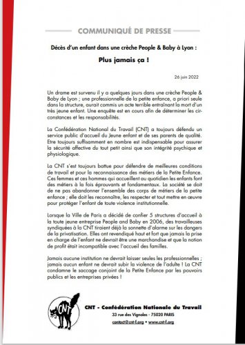 La CNT s’est toujours battue pour défendre de meilleures conditions de travail et pour la reconnaissance des métiers de la Petite Enfance. Ces femmes et ces hommes qui accueillent au quotidien les enfants font des métiers à la fois éprouvants et fondamentaux. La société se doit de ne pas abandonner l’ensemble des corps de métiers de la petite enfance ; elle doit les reconnaître, les respecter et tout mettre en œuvre pour protéger l’enfant de toute violence institutionnelle.
