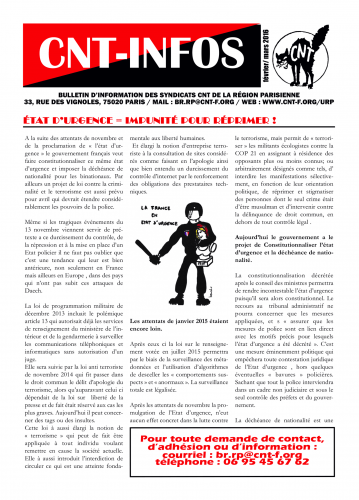 A la suite des attentats de novembre et de la proclamation de « l’état d’urgence » le gouvernement français veut faire constitutionnaliser ce même état d’urgence et imposer la déchéance de nationalité pour les binationaux. Par ailleurs un projet de loi contre la criminalité et le terrorisme est aussi prévu pour avril qui devrait étendre considérablement les pouvoirs de la police.
