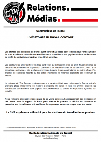 Le patronat et l’État français continue comme si de rien n’était alors même que la France est à la première place européenne en matière d’accidents du travail et que les chiffres excluent les travailleuses et travailleurs sans papiers, les fonctionnaires ou encore les exploitants agricoles non salariés.
