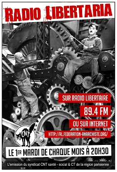 Il s’agit d’un nouveau créneau pour le syndicat CNT santé social & CT rp qui animait l’émission Le monde merveilleux du travail tous les 4e lundi du mois. Notre rendez-vous sera désormais tous les 1er mardi du mois dans le cadre de l’émission Radio Libertaria.