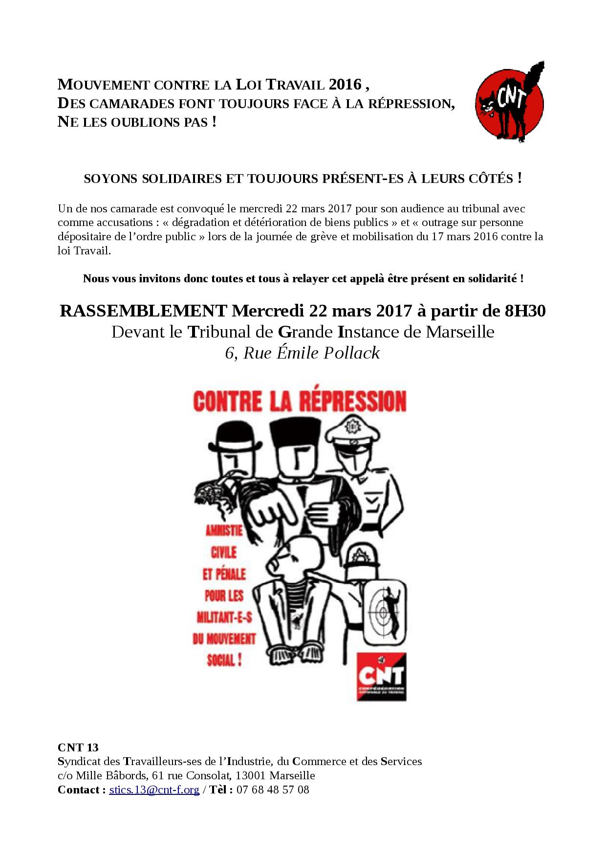 Un de nos camarade est convoqué le mercredi 22 mars 2017 pour son audience au tribunal avec comme accusations : « dégradation et détérioration de biens publics » et « outrage sur personne dépositaire de l’ordre public » lors de la journée de grève et mobilisation du 17 mars 2016 contre la loi Travail.