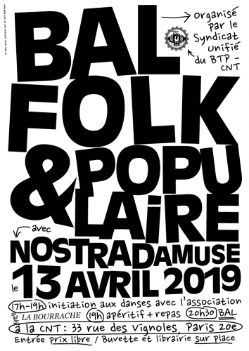 Le Syndicat Unifié du BTP BAM - région parisienne de la CNT-f vous invite à commémorer le samedi 13 avril 2019 la Commune de Paris et plus particulièrement le 16 avril 1871, date à laquelle l’Assemblée de la Commune adopte le « Décret de convocation des chambres syndicales ouvrières ». Cette commémoration sera suivie d’une initiation aux danses et d’un bal folk à la CNT.