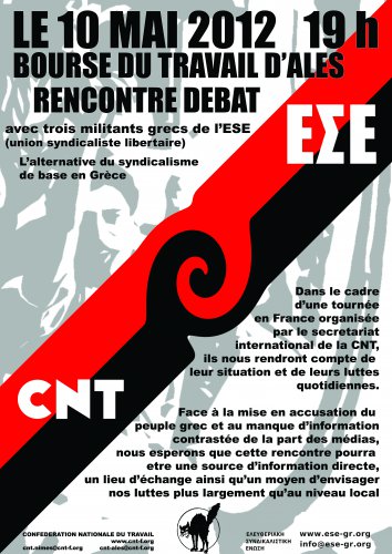 Dans le cadre d’une tournée en France, organisée par le secrétariat international de la CNT, la CNT du Gard organisera jeudi 10 Mai à 19h00 à la bourse du travail d’Ales, une réunion publique avec des syndicalistes grecs de l’ESE (Union syndicaliste libertaire).