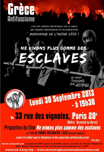 Projection du film Ne vivons plus comme des esclaves, un film de YANNIS YOULOUNTAS - 2013 (version française) suivie d’un débat avec le réalisateur et des camarades antifascistes grecs.