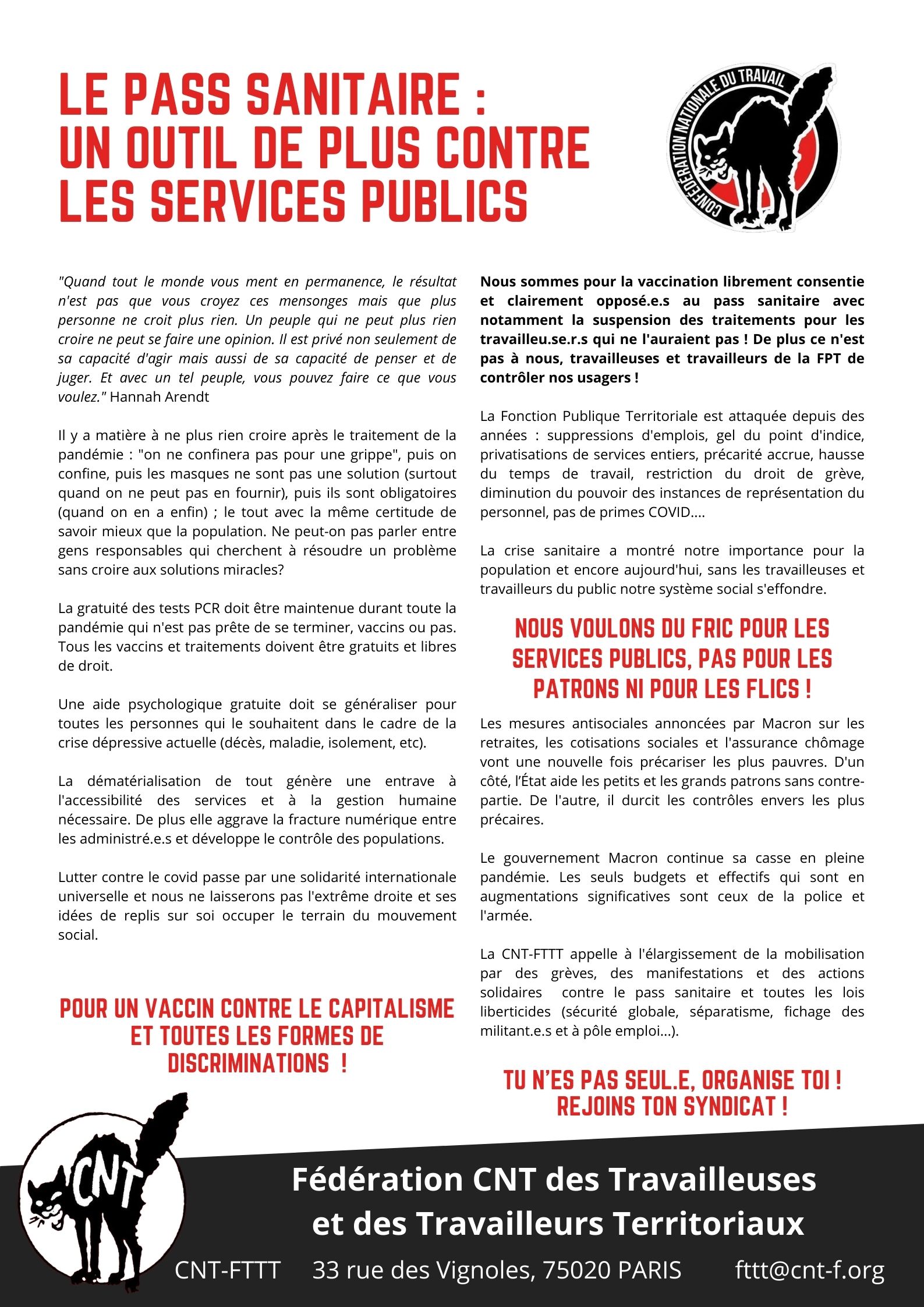 La CNT-FTTT appelle à l’élargissement de la mobilisation par des grèves, des manifestations et des actions solidaires contre le pass sanitaire et toutes les lois liberticides (sécurité globale, séparatisme, fichage des militant.e.s et à pôle emploi...).