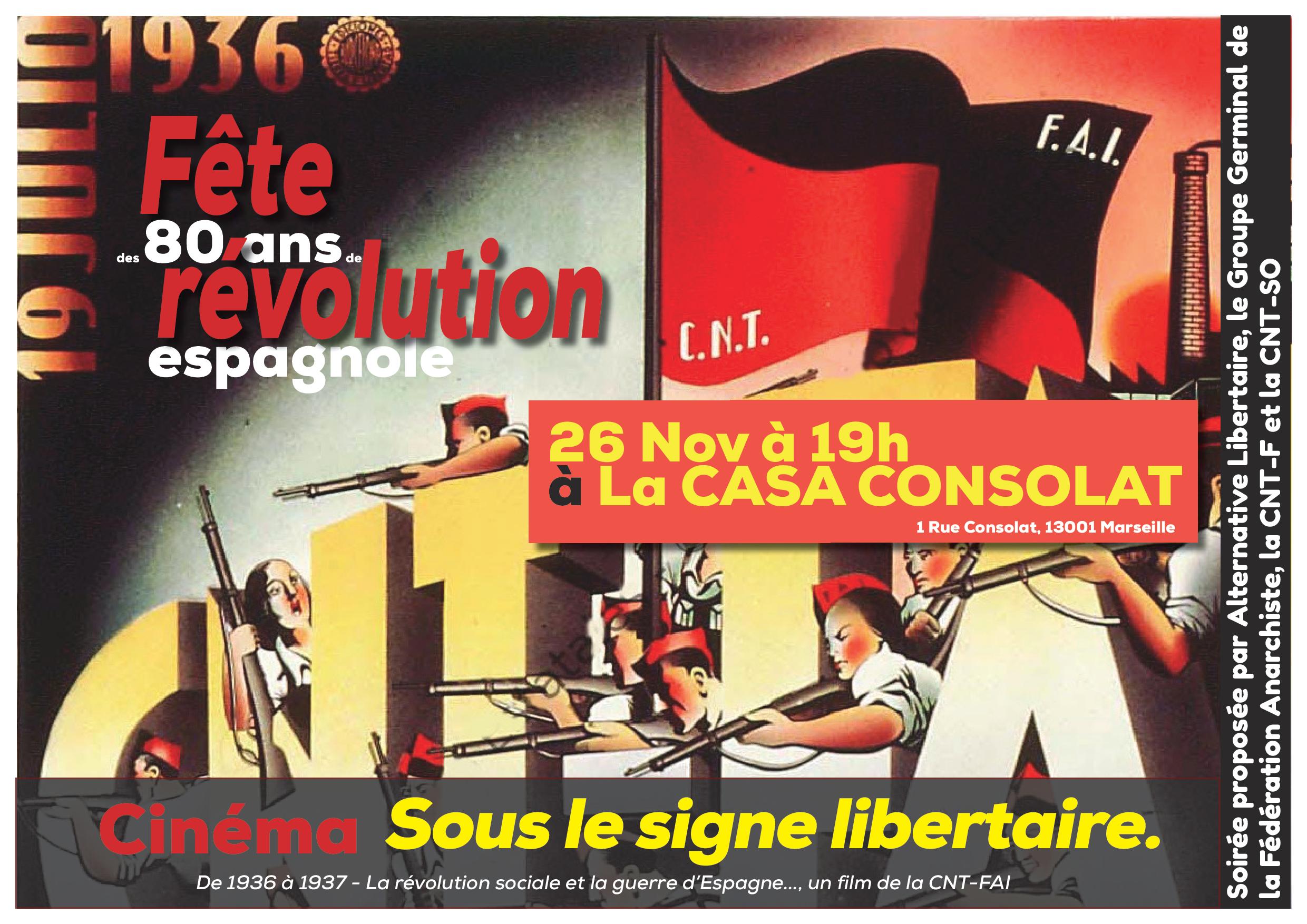 Pour continuer à fêter les 80 ans de la révolution espagnole, nous vous invitons à une soirée cinéma sous le signe libertaire, avec une projection : "1936-1937 : La révolution sociale et la guerre d’Espagne", suivi d’une discussion et d’échanges dans la convivialité.