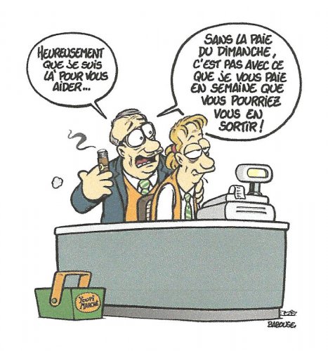Aaah ! Le travail les dimanches ! Voilà bien une victoire des anti-cléricaux bourgeois sur un repos dominical qui n’a jamais été déterminé que pour sa symbolique religieuse chrétienne au nom du libre exercice de la messe... Mais voilà ! La société française n’est plus ce qu’elle était, la vie spirituelle non plus. La population préfère souvent le farniente au dur labeur ; la vie de famille à la production industrielle ; la récréation culturelle à la saine activité salariale, bref, les travailleurs en France, qu’ils soient athées ; de gauche ; SDF ; d’une autre religion ; ou simplement réfractaires à tout se vautrent dans le lucre et la paresse ces jours-là !