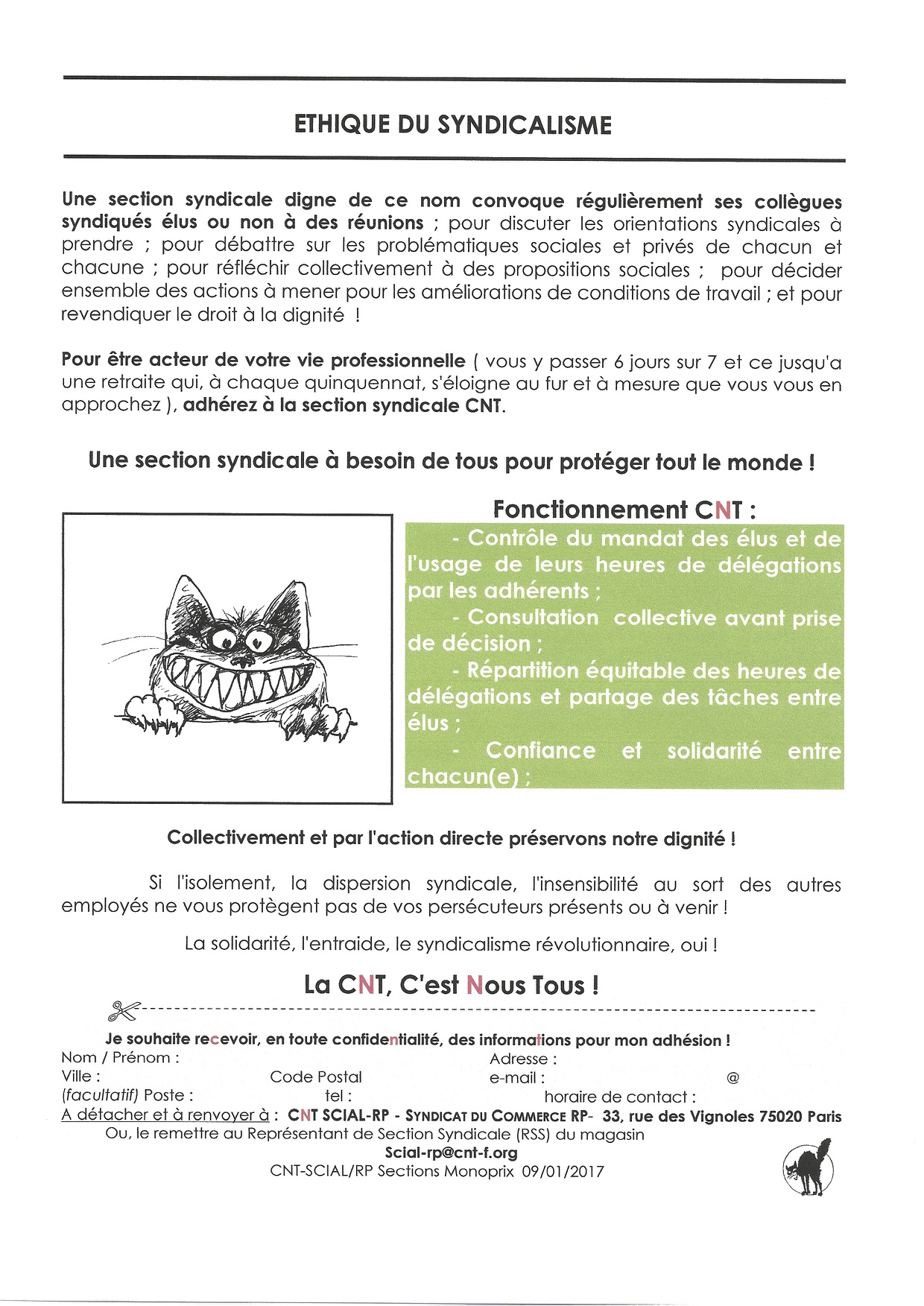 Pour être acteur de votre vie professionnelle ( vous y passer 6 jours sur 7 et ce jusqu’à une retraite qui, à chaque quinquennat, s’éloigne au fur et à mesure que vous vous en approchez ), adhérez à la section syndicale CNT.