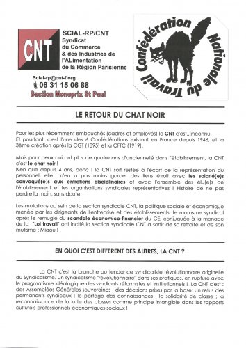 Les mutations au sein de la section syndicale CNT, la politique sociale et économique menée par les dirigeants de l’entreprise et des établissements, le marasme syndical après le remugle du scandale économico-financier du CE, conjuguée à la menace de la "Loi travail" ont incité la section syndicale CNT à sortir de sa retraite et de son mutisme : Miaou !