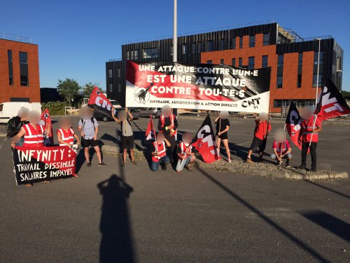 Cela contraint le syndicat CNT Industries & Services de Haute-Garonne à entamer un conflit syndical contre l’entreprise Infynity. Un premier piquet syndical a réuni une quinzaine de syndicalistes devant le chantier sur lequel les trois ouvriers ont travaillé pour l’entreprise Infynity. Sur place, nous avons constaté qu’Infynity n’y intervenait plus comme sous-traitant.