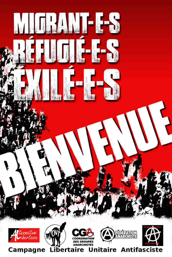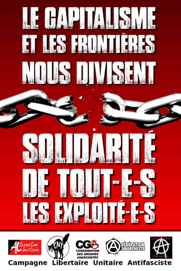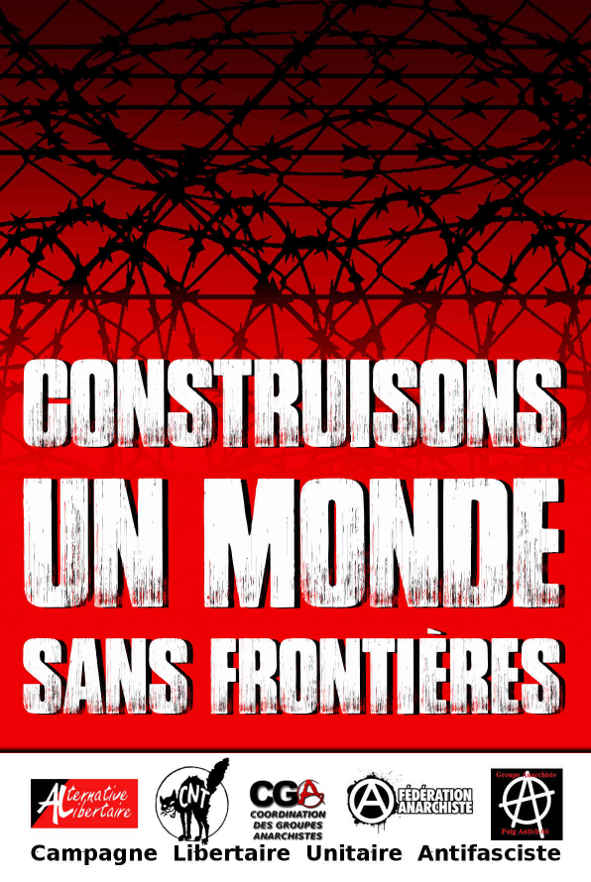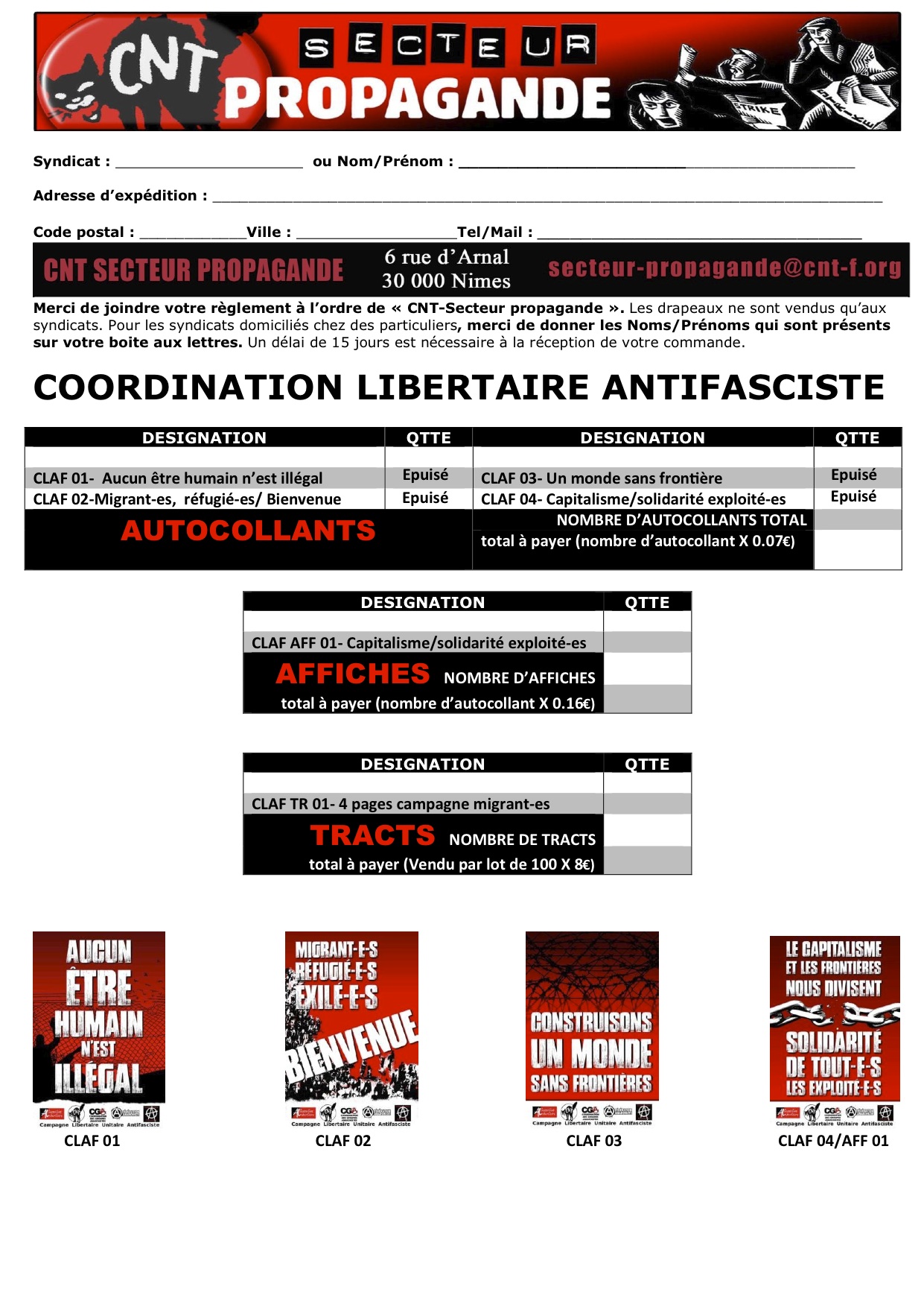Affiche CLAF claf 01 CLAF 02 CLAF 03 CLAF 04 BON DE COMMANDE Dans le cadre de la Coordination Libertaire Antifasciste (CLAF) à laquelle la CNT participe, vous trouverez la campagne unitaire sur les migrant-es. NI NATIONS, NI FRONTIERES : MIGRANT-ES VOUS ETES LES BIENVENU-ES ! Bon de commande à télécharger ci dessous :