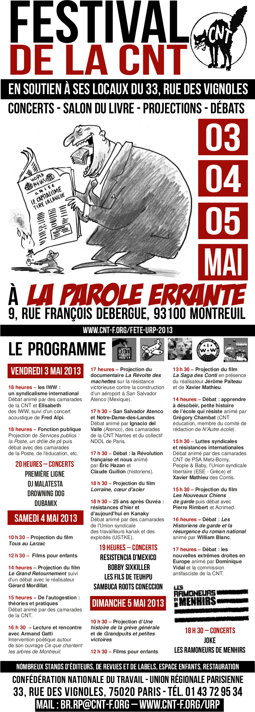 L’entrée est à prix libre. Le festival CNT se déroulera les 3, 4 et 5 mai 2013 à partir de 18 heures le vendredi et de 10 heures les samedi et dimanche à La Parole errante, 9, rue François Debergue 93100 Montreuil, métro Croix-de-Chavaux.