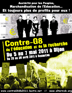 Collectif d’organisation du contre G8 de l’Éducation et de la Recherche : (Alternatifs 21, AMEB, ATTAC21, ATTAC Besançon, CGT-Ferc, CNT21, CUAE, FASE, FSU21, Forum social local21, NPA21, RUSF21, RUSF Franche-Comté, SNASUB-FSU 21, SNESUP 21, Sud éducation Franche-Comté, UEC 21, UGED-FSE, Individu-e-s)