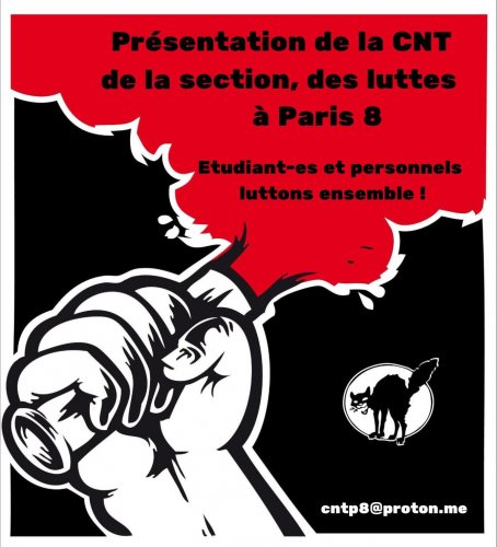 Car malgré ce sombre tableau, la volonté de lutter ne s’éteint pas. En ce qui nous concerne, la CNT, implantée dans le secteur de l’enseignement supérieur et la recherche à Bordeaux, Marseille, et en région parisienne, s’est récemment renforcée de la création d’une section syndicale à l’université Paris 8, qui exprime clairement ses objectifs : face à toutes les formes d’oppressions, contre la privatisation des universités et des savoirs, la précarité et la dégradation des conditions d’études et de travail de ses membres, organisons-nous et faisons face ensemble pour une université autogérée, libre et ouvertes à toutes et tous !
