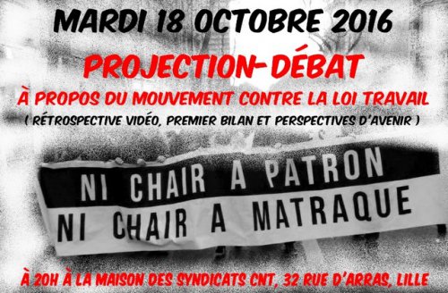 Mardi 18 octobre, l’union locale des syndicats CNT de Lille organise une projection-débat pour faire un premier bilan du mouvement contre la loi Travail et discuter des luttes futures.