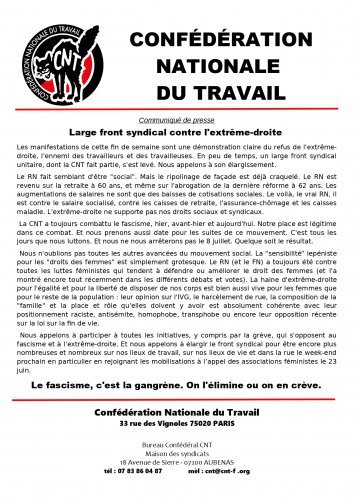 La CNT a toujours combattu le fascisme, hier, avant-hier et aujourd’hui. Notre place est légitime dans ce combat. Et nous prenons aussi date pour les suites de ce mouvement. C’est tous les jours que nous luttons. Et nous ne nous arrêterons pas le 8 juillet. Quel que soit le résultat.
