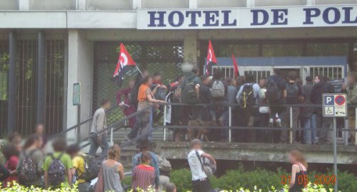 Des camarades CNT sont là pour m’accueillir ainsi que d’autres personnes qui nous avaient déjà croisé. Ils ont fait le pied de grue devant l’hotel de police toute l’après midi ! Merci encore à eux, ca fait du bien !