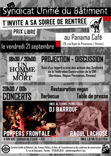 En collaboration avec Le Panama, le Syndicat Unifié du Bâtiment (SUB) de Rennes et ses Environs de la CNT t’invite à sa soirée de rentrée !