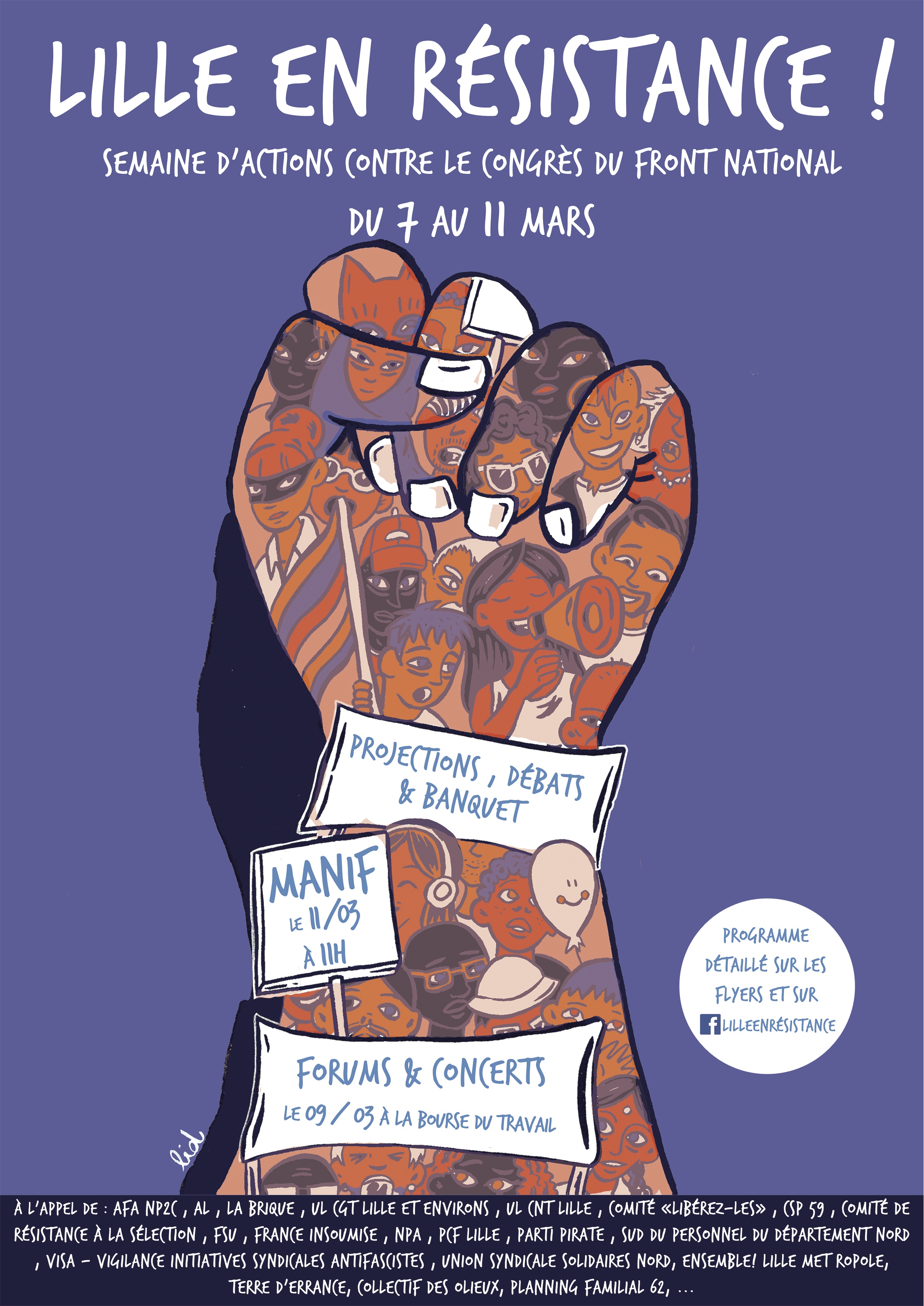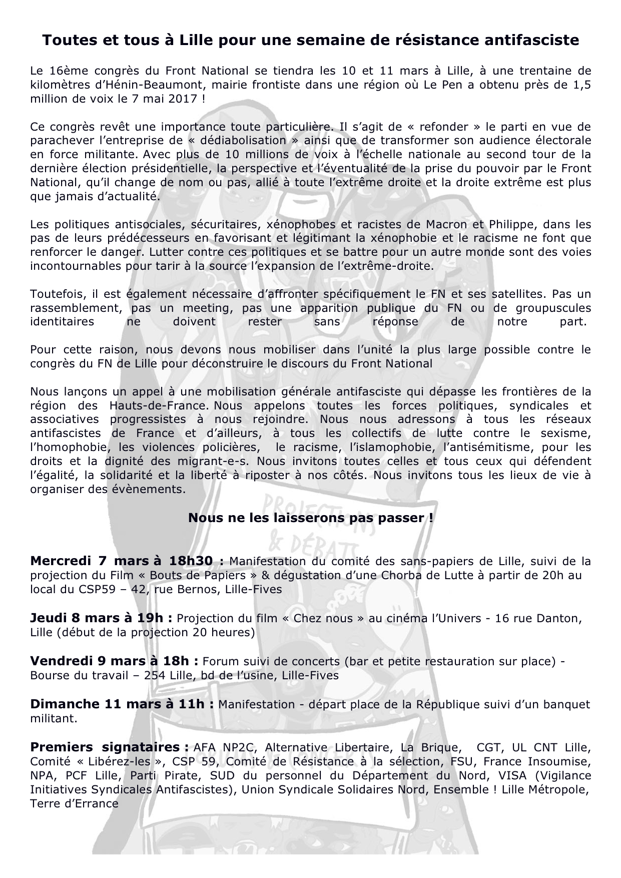 Premiers signataires : AFA NP2C, Alternative Libertaire, La Brique, CGT, UL CNT Lille, Comité « Libérez-les », CSP 59, Comité de Résistance à la sélection, FSU, France Insoumise, NPA, PCF Lille, Parti Pirate, SUD du personnel du Département du Nord, VISA (Vigilance Initiatives Syndicales Antifascistes), Union Syndicale Solidaires Nord, Ensemble ! Lille Métropole, Terre d’Errance