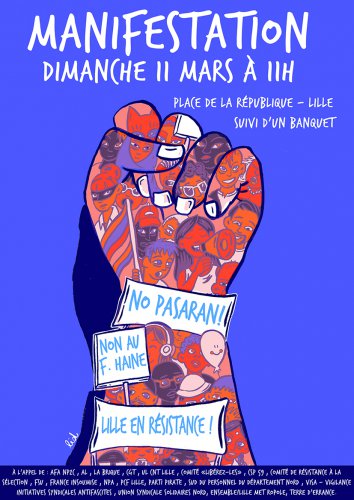 Nous lançons un appel à une mobilisation générale antifasciste qui dépasse les frontières de la région des Hauts-de-France.Nous appelons toutes les forces politiques, syndicales et associatives progressistes à nous rejoindre. Nous nous adressons à tous les réseaux antifascistes de France et d’ailleurs, à tous les collectifs de lutte contre le sexisme, l’homophobie, les violences policières, le racisme, l’islamophobie, l’antisémitisme, pour les droits et la dignité des migrant-e-s. Nous invitons toutes celles et tous ceux qui défendent l’égalité, la solidarité et la liberté à riposter à nos côtés. Nous invitons tous les lieux de vie à organiser des évènements.