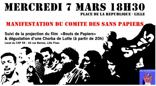 Mercredi 7 mars à 18h30 : Manifestation du comité des sans-papiers de Lille, suivi