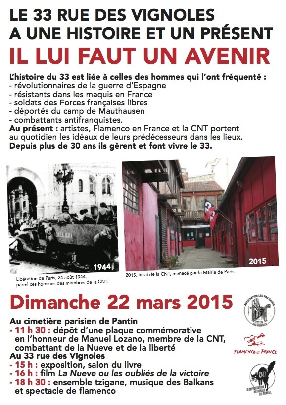 Au présent : artistes, Flamenco en France et la CNT portent au quotidien les idéaux de leurs prédécesseurs dans les lieux. Depuis plus de 30 ans ils gèrent et font vivre le 33.