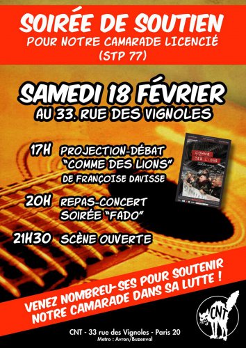 Notre camarade va devoir faire appel de cette décision scandaleuse. Mais toutes ces démarches ont un coût financier important. C’est pourquoi, le STP77 et le STE75 coorganisent une soirée de soutien pour récolter des fonds afin de lui permettre de poursuivre la lutte contre son employeur.