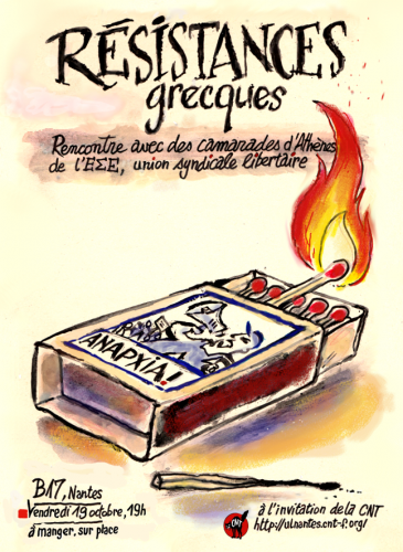 Le vendredi 19 octobre à 19h à B17, la CNT nantaise accueillera des militant·e·s anarchosyndicalistes grec·que·s de l’ESE. Ce sera l’occasion d’échanger sur la situation du mouvement social en Grèce. Bouffe et buvette sur place...