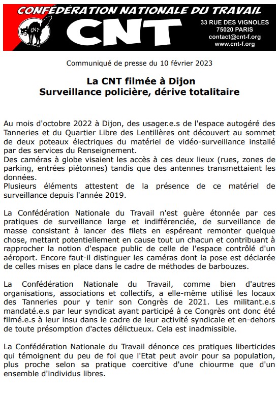 La CNT filmée à Dijon Surveillance policière, dérive totalitaire